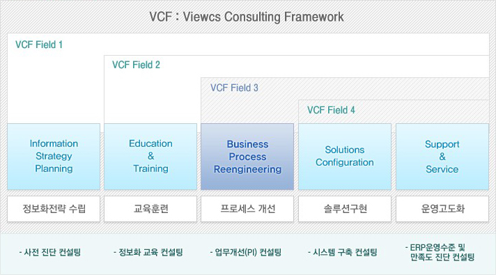 ERP consulting ¼öÇà ¹æ¹ý·ÐÀÎ VCF(Viewcs consulting Framework)¸¦ Àû¿ëÇÏ¿© °í°´ÀÇ Á¤º¸È ±¸Ãà°ú ÇÁ·Î¼¼½º °³¼±È°µ¿ÀÇ È¿À²¼ºÀ» Àç°í ÇÕ´Ï´Ù.