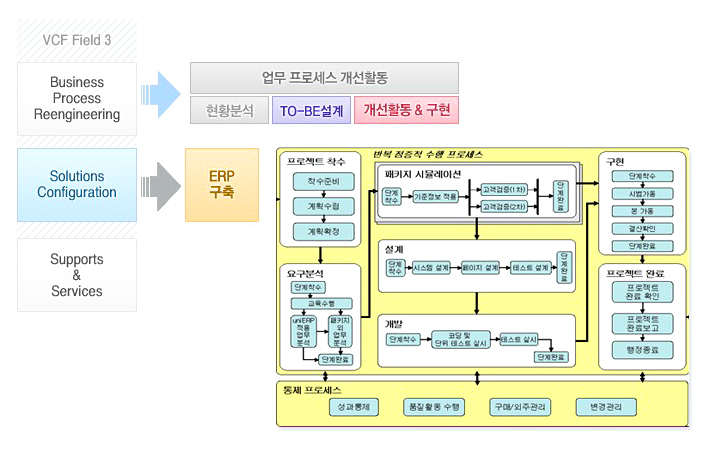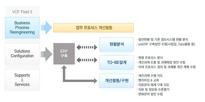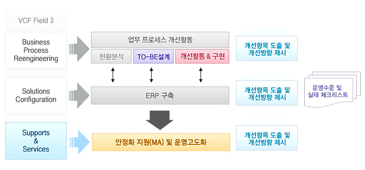 ÃÖÀûÀÇ Á¤º¸ ½Ã½ºÅÛ °³¼± ¹æ¹ýÀ¸·Î VCF Field °í°´»çÀÇ ¸ÂÃãÇüÀ¸·Î Àû¿ëÇÕ´Ï´Ù. ¾÷¹« ÇÁ·Î¼¼½º °³¼±È°µ¿À» ±âº»À¸·Î VCF Field 3 ¹æ¹ý·ÐÀ» Àû¿ëÇÔÀ¸·Î¼ ERP±¸Ãà È¿À²¼ºÀ» Àç°í ÇÕ´Ï´Ù.